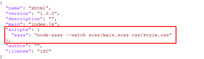 Everything is ready to write a small script in order to compile Sass. Open the package.json file in a code editor. You will see something like this: